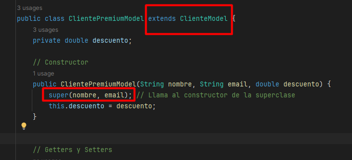 En el constructor usamos super para llamar al constructor de nuestra clase ClienteModel: