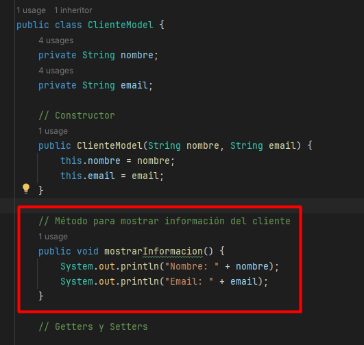 Dentro de la clase ClienteModel vamos a añadir un método nuevo que se va a encargar de mostrar la información de un cliente: