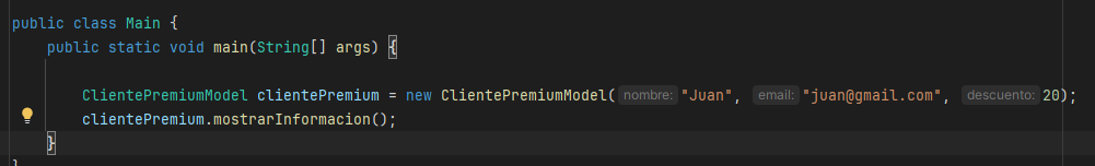 Ahora si instanciamos un ClientePremium veremos que podemos usar los atributos y métodos como si fuera un Cliente normal y además usar también el atributo “descuento” que es único para ClientePremium.